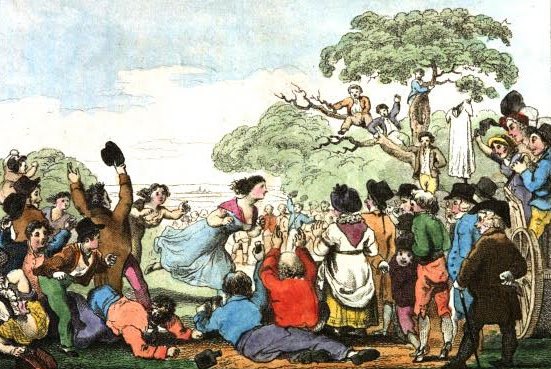 “..a ride into the country to a smock-race or a grinning-match (!), a jolly dinner and a drinking-bout after it; a mad scamper home with a flounce into the mud.” — The New Wonderful Museum and Extraordinary Magazine (1805)
