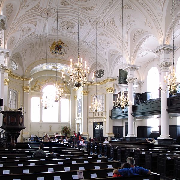 The ceiling of St. Martin in-the-Fields, designed by Gibbs, influenced the plasterwork ceilings of many Regency-era homes, including Burwell’s. photo via Wikimedia Commons, Steve Cadman photographer