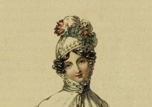 Another of the prints we like to decorate our Regency blogs with–thank you, Mr. Bell–which features a French court dress, with the court lace lappets suspended from a tiara of gold and pearls. La Belle Assemblée, Vol. 17 & 18, Jan-Dec 1818